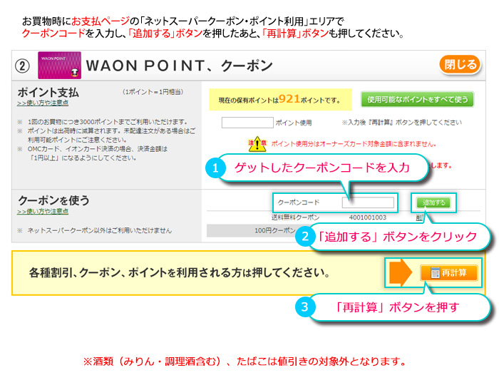 お手元にクーポンコードが届いた会員様へ ※予約のご注文時にクーポンをご利用の際は、お支払画面下方の配達日を 指定いただいてからコードをご入力ください。 ※ダイエーネットスーパークーポン以外のクーポンコードはご利用になれません。 あらかじめご了承くださいませ。