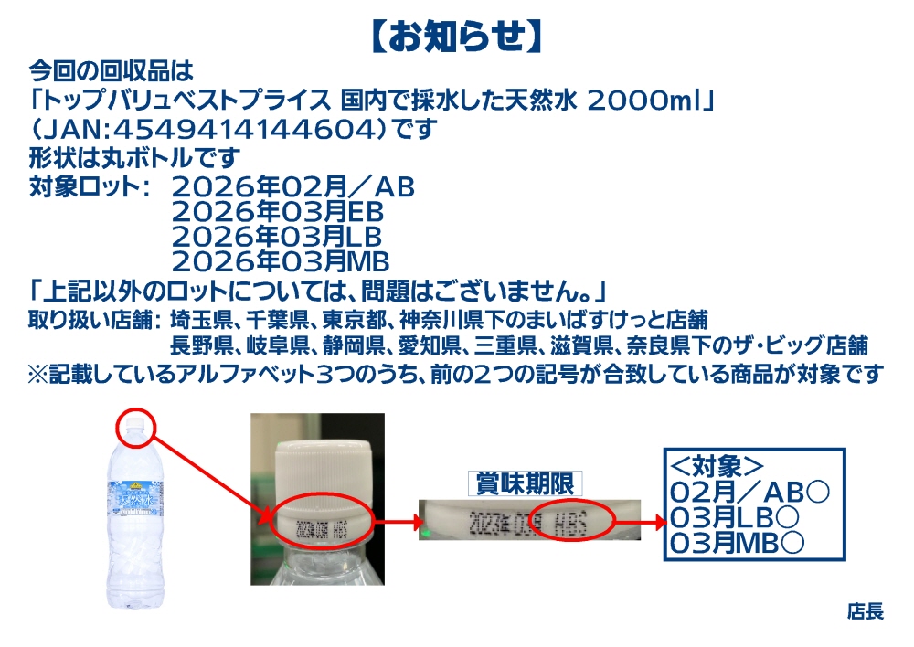 今回報道されております、ベストプライス天然水2Lの異臭による商品回収につきまして、ダイエーネットスーパーで販売しております商品は、回収商品とは異なりますので、ご安心してご利用ください。